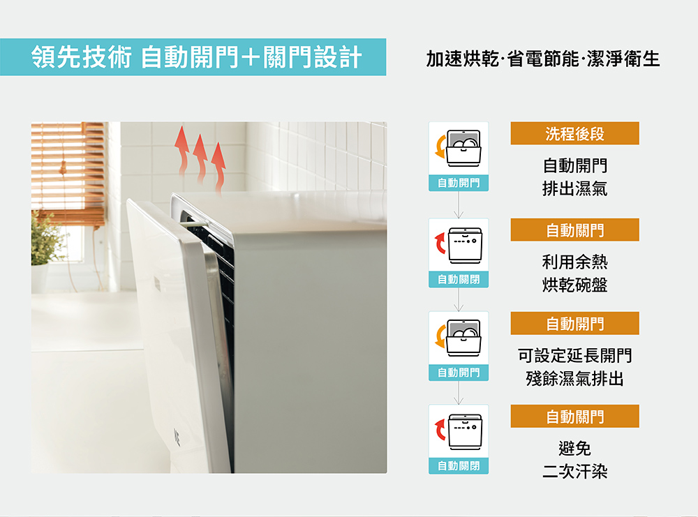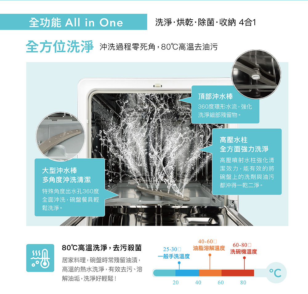 .最高80度高溫洗淨+餘熱烘乾